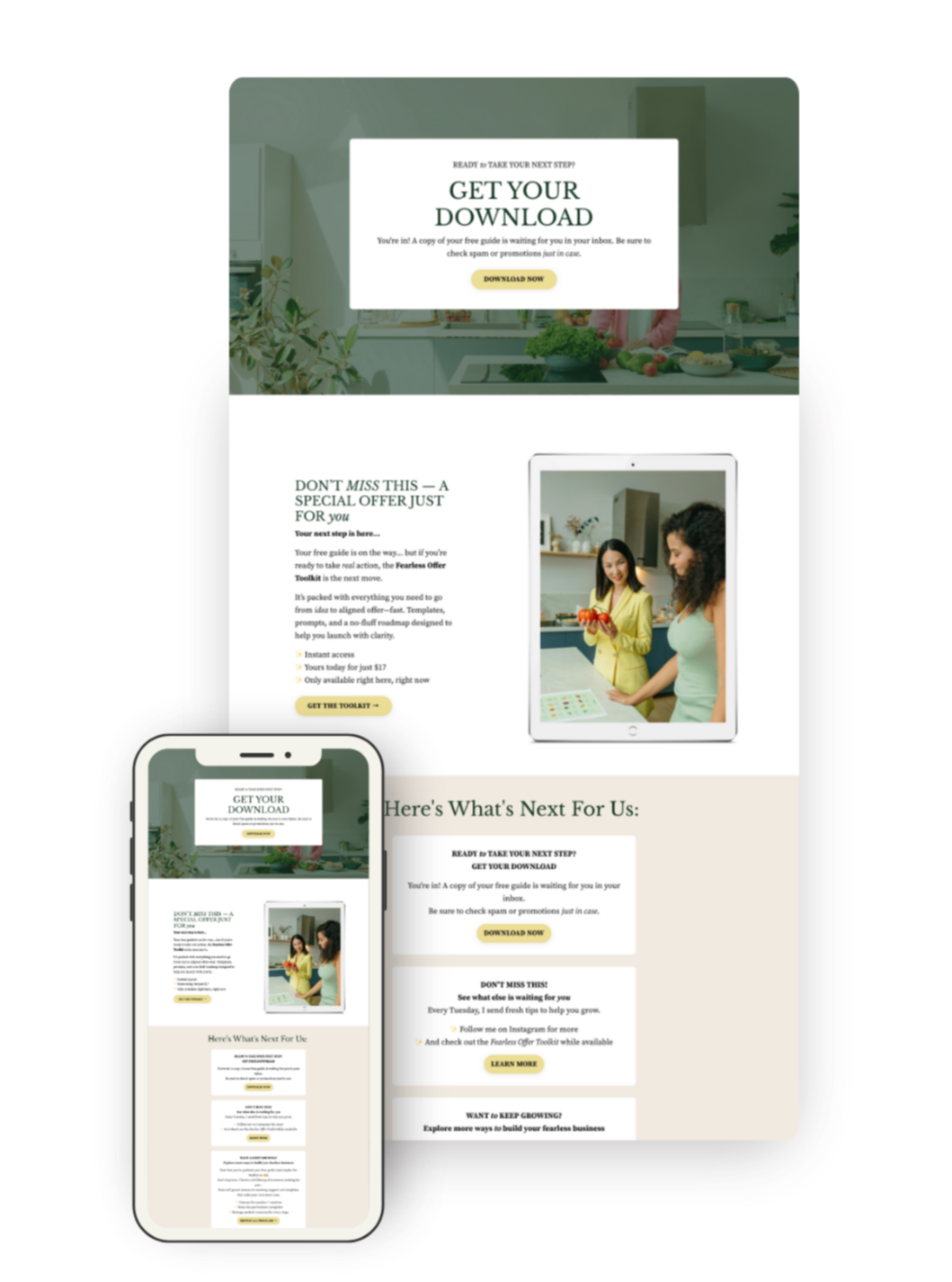 A complete opt-in page, thank you page, and email delivery sequence — pre-built in Kajabi. Swap in your lead magnet, customize the colors, and publish. Your first funnel can be live in under an hour.